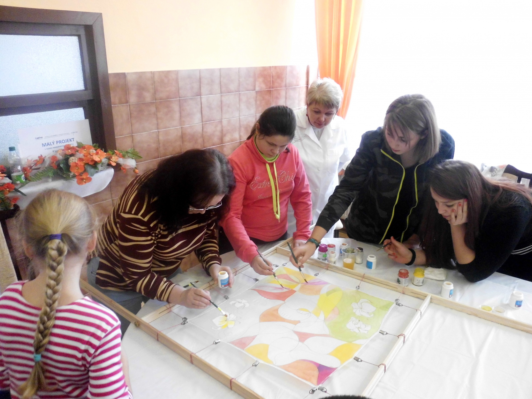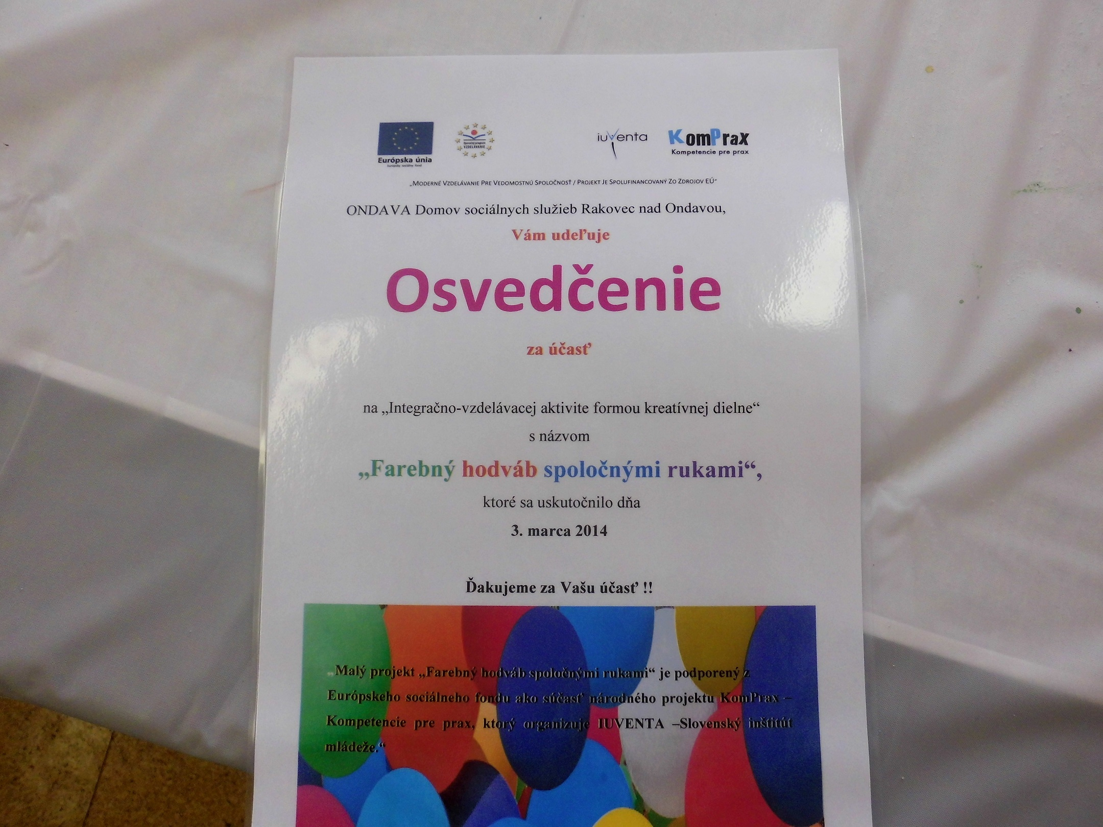 Malý projekt "Farebný hodváb spoločnými rukami" je podporený z Európskeho sociálneho fondu ako súčasť národného projektu KomPrax- Kompetencie pre prax, ktorý organizuje IUVENTA- Slovenský inštitút mládeže.Projekt "Farebný hodváb spoločnými rukami",  sa konal dňa 03.03.2014 v priestoroch zariadenia ONDAVA- DSS Rakovec nad Ondavou.  Hlavným cieľom projektu bolo zoraganizovať "Integračno-vzdelávaciu aktivitu formou kreatívnej dielne" , kde sa mladí ľudia učili maľovať na hodváb. Všetci účastníci nadobudli zručnosti a rozvinuli si jemnú motoriku. Týmto projektom sme chceli ukázať mladej intaktnej populácií, že aj mladí handicapovaní žijúci v zariadeniach sociálnych služieb, sú obdarení dannosťami a šikovnosťou, a že estetično, priateľkosť a spolupráca nie sú im cudzie pojmy.Projektu sa zúčastnili mladí dospelí prijímatelia zariadenia ONDAVA-DSS Rakovec nad Ondavou, a študenti gymnázia. Nakoľko sa projekt realizoval v čase jarných prázdnin, pozrieť a vyskúšať štetce si prišli aj menší žiaci základnej školy.Výsledkom projektu boli farebne namaľové hodvábne šatky, s motýlikmi, kvetmi ale aj geometrickými tvarmi.Radosť zo spoločne vytvorených šatiek bolo vidno na tvárach ako prijímateľov tak aj mladých intaktných dospelých. Nové tváre, nové mená, nové skúsenosti zostanú ukryté v spomienkach každého účastnika.Za tento krásny deň plný zážitkov sa v prvom rade chceme poďakovať Národnému projektu KomPrax- Kompetencie pre prax, z ktorého  finančnou podporou sme mohli tento projekt zorganizovať.