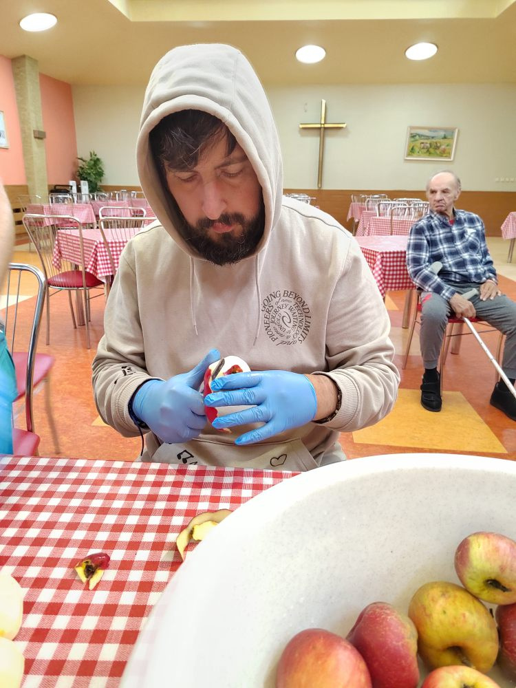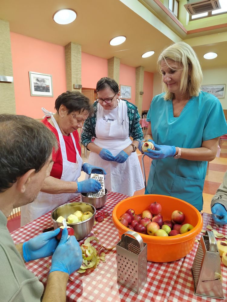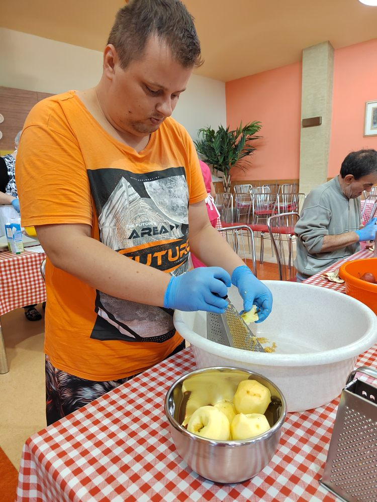 Bol krásny septembrový deň a my sme sa pustili do prípravy jablčníka. O prípravu koláča sa aj tento rok postarali naši prijímatelia sociálnej služby v spolupráci s inštruktormi a pracovníkmi na rozvoj pracovných zručnosti.