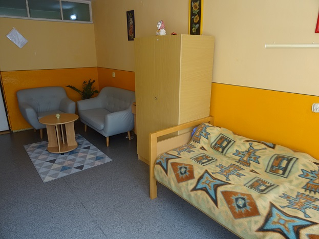 Ubytovanie je zabezpečené v jedno, dvojlôžkových a  trojlôžkových izbách . Na 1. a 2. poschodí sú 4 bunky, kde majú klienti vlastné sprchy a WC. Prijímateľ sociálnej služby má v izbe k dispozícii posteľ, nočný stolík, skriňu, konferenčný stolík a stoličky.