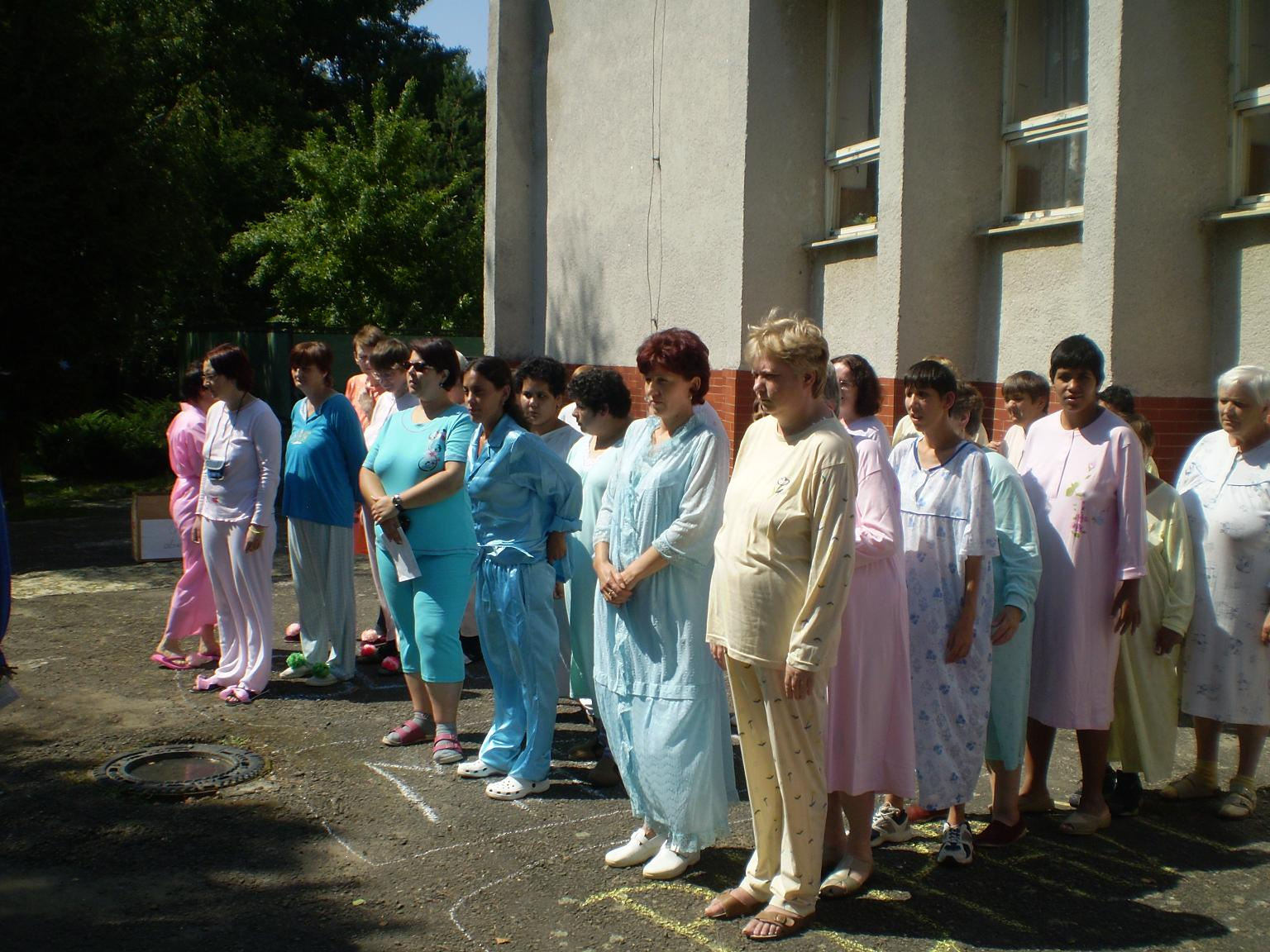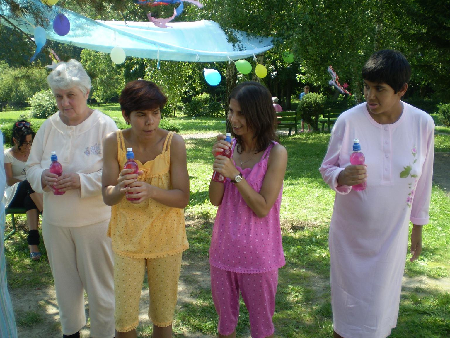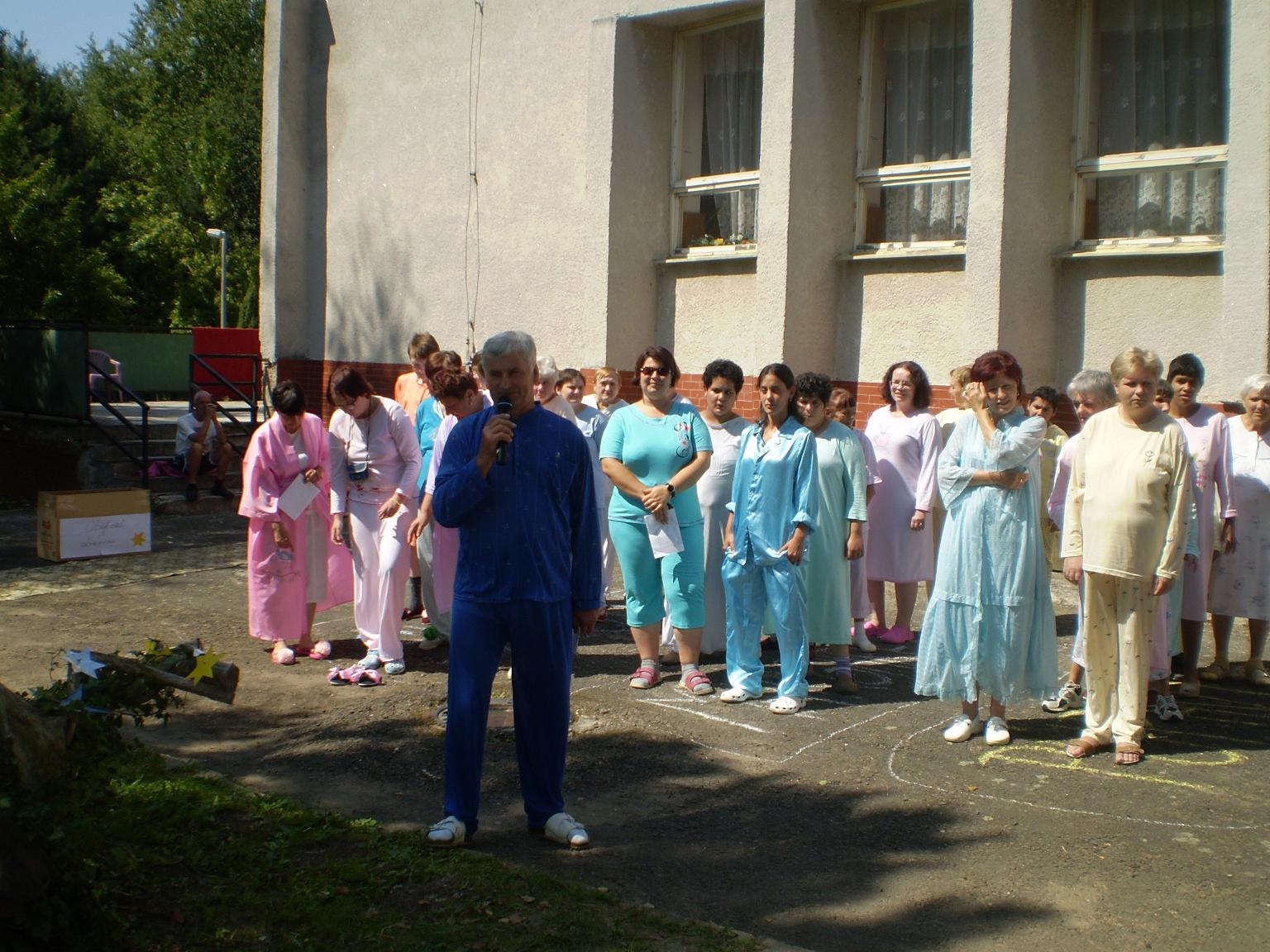 "Pyžamová párty"  sme nazvali deň, ktorý sa niesol vo veľmi zábavnej atmosfére. Poobliekané pyžamá mali nielen klienti, ale aj zamestnanci zariadenia.  Všetko sa konalo vonku v prírode. Veľmi vkusne vyzdobené priestory pripomínali spálňu- vonku. Čože by to bolo za popoludnie bez súťažných disciplín ako :pitie z  fľaše,obchod s  obuvou,čo do prírody nepatrí, pochod s  jablkom, hod papučou do krabice a iné podobné a veľmi zaujímavé. Každá súťažná disciplína mala víťaza, ktorý bol odmenený. Jednotlivé súťažné disciplíny sprevádzala muzika- Šmolkovia. Predposledným bodom popoludnia bolo počúvanie  rozprávky audio nahrávky. Ako posledný bod bolo vyhodnotenie top modela a modelky "Pyžamovej párty".