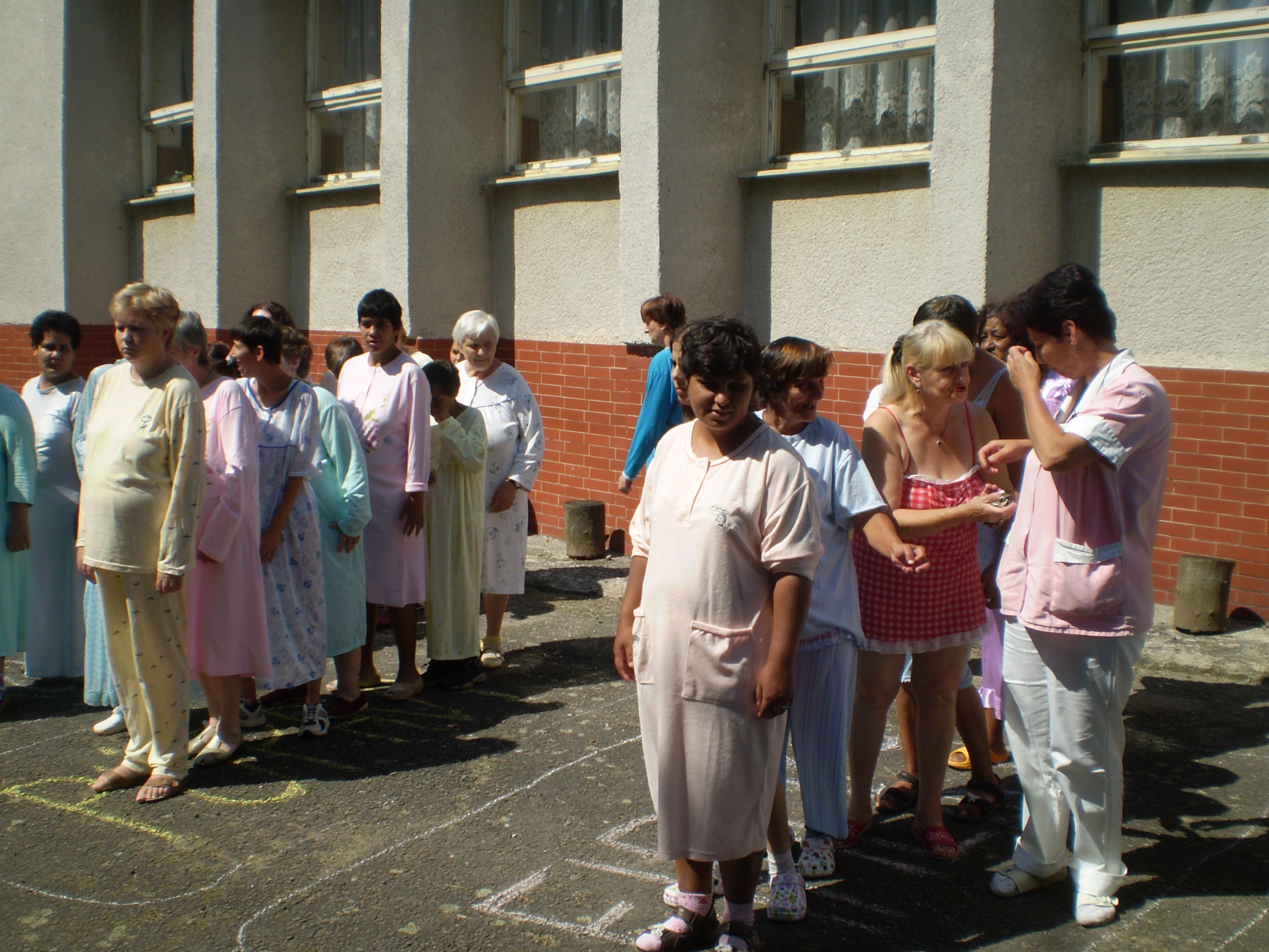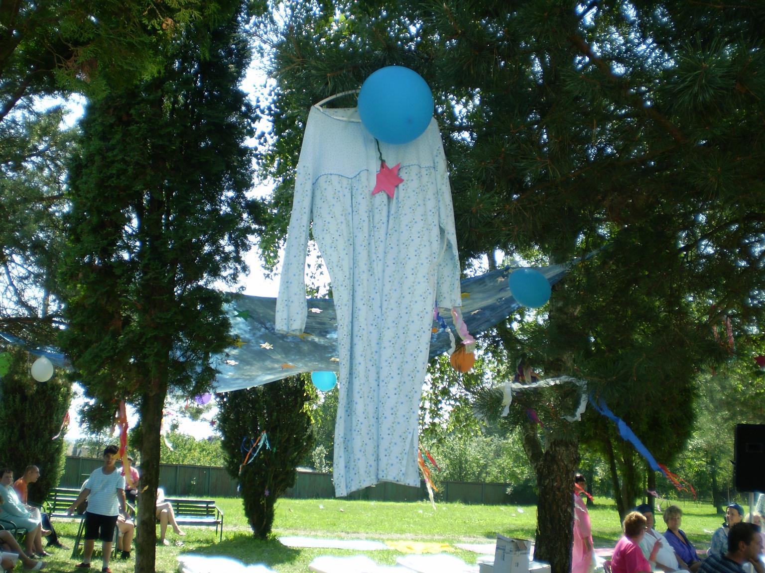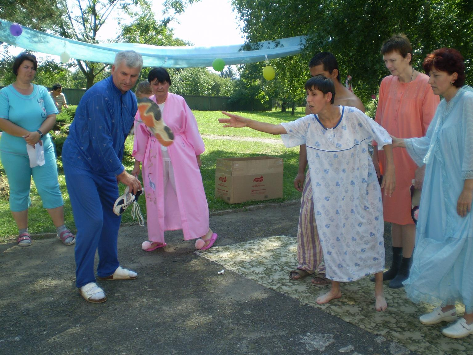 "Pyžamová párty"  sme nazvali deň, ktorý sa niesol vo veľmi zábavnej atmosfére. Poobliekané pyžamá mali nielen klienti, ale aj zamestnanci zariadenia.  Všetko sa konalo vonku v prírode. Veľmi vkusne vyzdobené priestory pripomínali spálňu- vonku. Čože by to bolo za popoludnie bez súťažných disciplín ako :pitie z  fľaše,obchod s  obuvou,čo do prírody nepatrí, pochod s  jablkom, hod papučou do krabice a iné podobné a veľmi zaujímavé. Každá súťažná disciplína mala víťaza, ktorý bol odmenený. Jednotlivé súťažné disciplíny sprevádzala muzika- Šmolkovia. Predposledným bodom popoludnia bolo počúvanie  rozprávky audio nahrávky. Ako posledný bod bolo vyhodnotenie top modela a modelky "Pyžamovej párty".