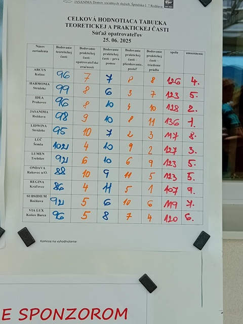 Dňa 25.06.2025 sa v zariadení sociálnych služieb Jasanima v Rožňave konal V. ročník súťaže odborných vedomostí a praktických zručností opatrovateliek a opatrovateľov zariadení sociálnych služieb KSK pod záštitou predsedu KSK.